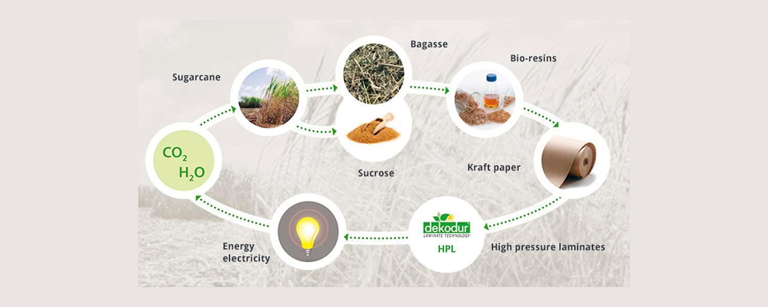 Som følge heraf har denne type laminat en formaldehydemission på under 0.002 ppm. Kernen består af det 100% biologiske materiale Bagasse, som er et restprodukt fra udvinding af sukker fra sukkerrør. Laminaten er dermed fremstillet af vedvarende ressourcer, og er fuldt genanvendelig.