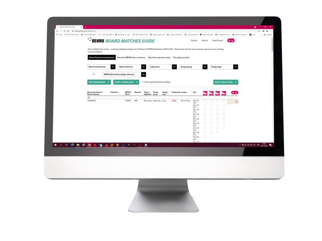På REHAU’s hjemmeside kan du nemt og enkelt søge en kant, der passer til din plade eller projekt. Du kan søge et match via pladeproducent, pladenummer, kollektion eller REHAU dekor-nummer – og dermed nemt finde det perfekte match.