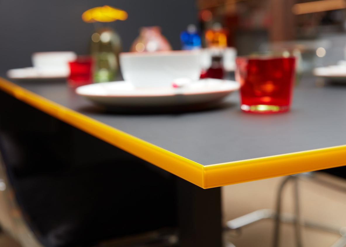 De er fremstillet i et kunststof, der er særligt slagfast og robust, hvilket gør dem særdeles velegnede til brug i offentlige rum. Kanterne fås i mange forskellige design- og farvevarianter samt dimensioner og kan bearbejdes på almindelige kantlimere.