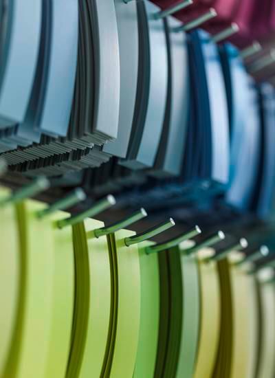 Vi lagerfører melaminbelagte kantbånd med eller uden smelteklæber, der alle matcher vores melaminpladesortiment.