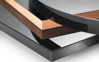 Disse kanter fremstår som kombinationen af en glasskive og en massiv træplade. De består af to farver eller dekorer, der løber over hinanden: en skinnende, ensfarvet nuance, der ligner en indfarvet glasskive, og f.eks. en bambus- eller multidekor.