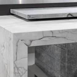 Kanterne har en tredimensional dybdevirkning, da den dekor, der er trykt på bagsiden, skinner gennem et transparent akryllag. Kollektionen består bl.a. af guld, kobber og bronze.