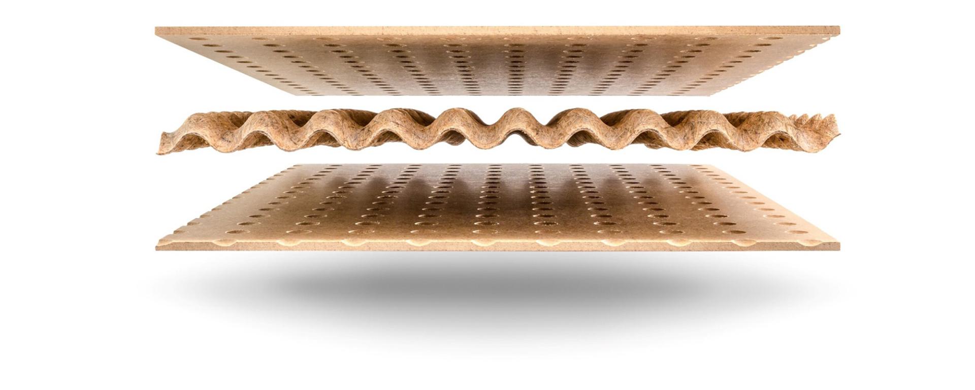 Kernen er en bølget plade fremstillet af pressede træ- og plantefibre, som bliver limet mellem to dæklag. Opbygningen, hvor toppene i den bølgede plade limes i punkt-udfræsninger i dækpladerne, gør konstruktion både stærk og stabil. Samtidig gør opbygningen, at der kan spares mere end 50 % af råmaterialet i forhold til konventionelle træbaserede plader.