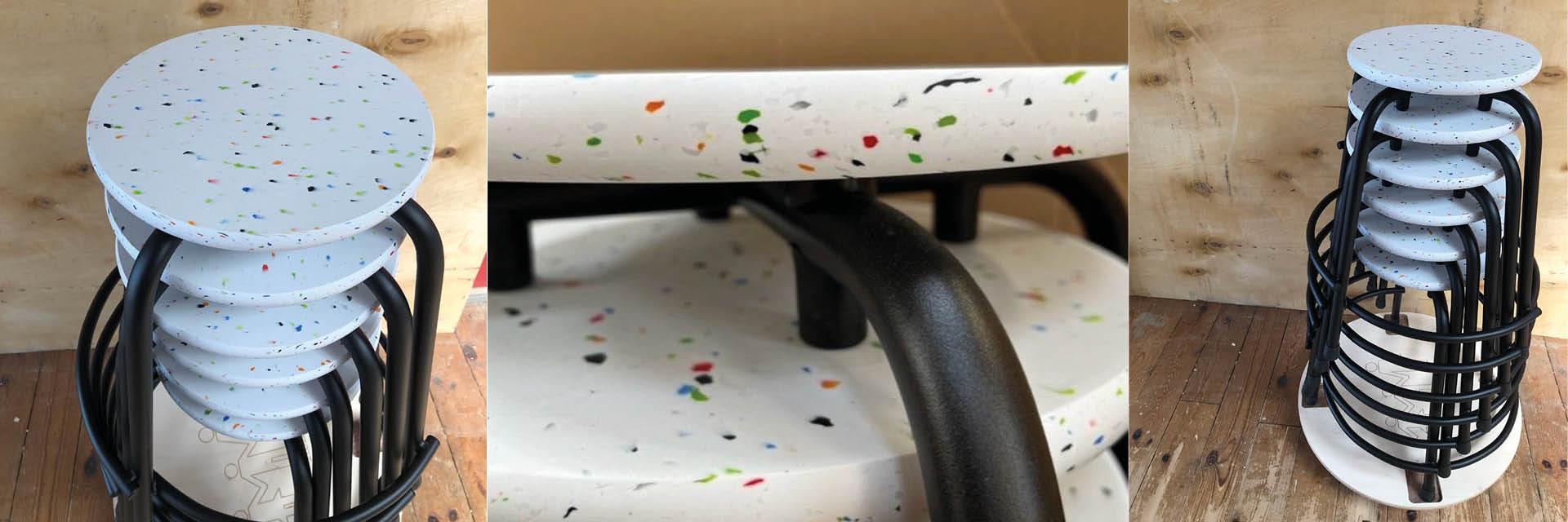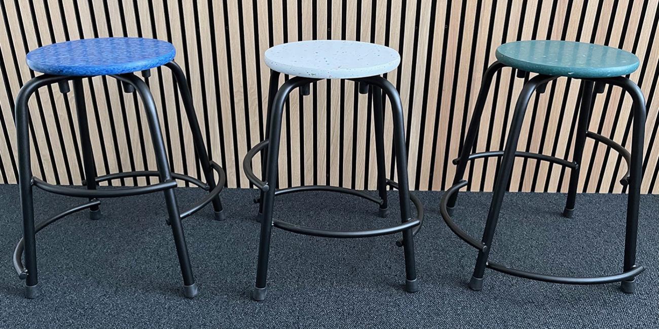 – Vi prøvede at arbejde med pladen for at se, hvad vi kunne bruge den til. Det mundede ud i en serie af taburetter, som vi kalder Taburet 98, da de består af 98 procent genanvendt materiale i form af Polygood-sædet. Understellet er i metal, lyder det.
